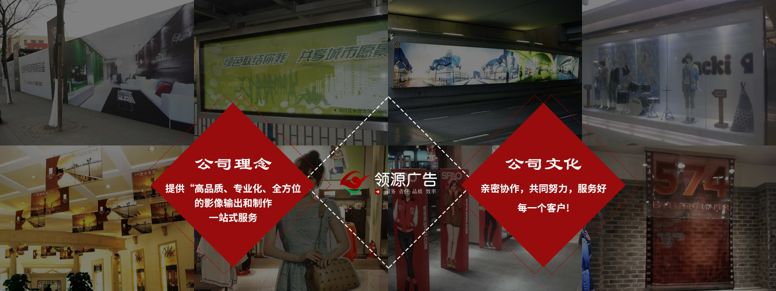 上海领源广告有限公司成立于2005年,是一家致力于商业影像的设计与服务为一体的广告制作公司。业务涵盖图片设计、广告制作、橱窗道具、会展路演、全国安装服务等,我们提供各类中高端数码灯片、数码相纸、单(双)喷灯布、墙纸、写真(户内,户外)海报、写真灯片、以及特种板材打印等输出业务。公司相继在上海、成都、北京、深圳等地都设有制作基地。
